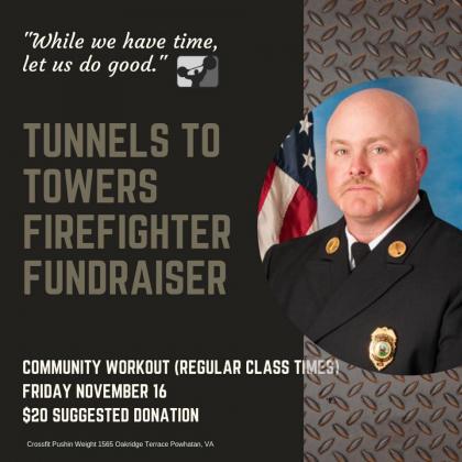 karasilva Wednesday, November 7, 2018 - 23:30 You are here Home Blog Come join us on 11/ 16 for a Fighter Fighter Fundraiser workout All classes, all abilities. Come join us as we raise money for the Tunnels to Towers in honor of Lt. Brad Clark who recently lost his life in the line of duty. Cash donation of $20 all proceeds will go to charity. Image