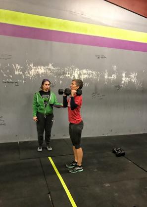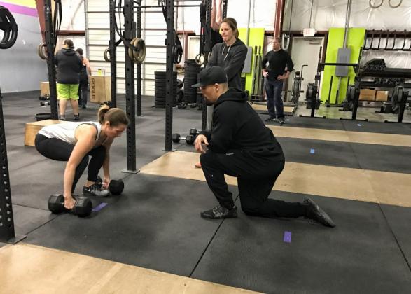 17.2: Emily E. getting set for dumbbell lunges with Tyler as her judge